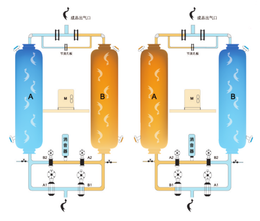 无热再生吸附式压缩空气干燥机是利用干燥剂材料本身所特有的微孔,根据毛细作用吸附空气中的水分子,同时根据卸压脱附和吸附余热升温来脱去所吸附的水分。设备一般制成双筒形式,在程序控制器的控制下,两筒交替工作,筒吸附水分,另一筒解吸再生,连续循环地工作。